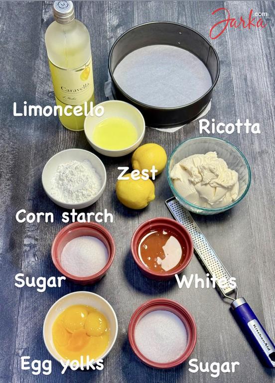 In a mixing bowl, whisk ricotta, egg yolks, and 90 g sugar until smooth. Whisk in starch, limoncello, and the zest of 2 lemons.